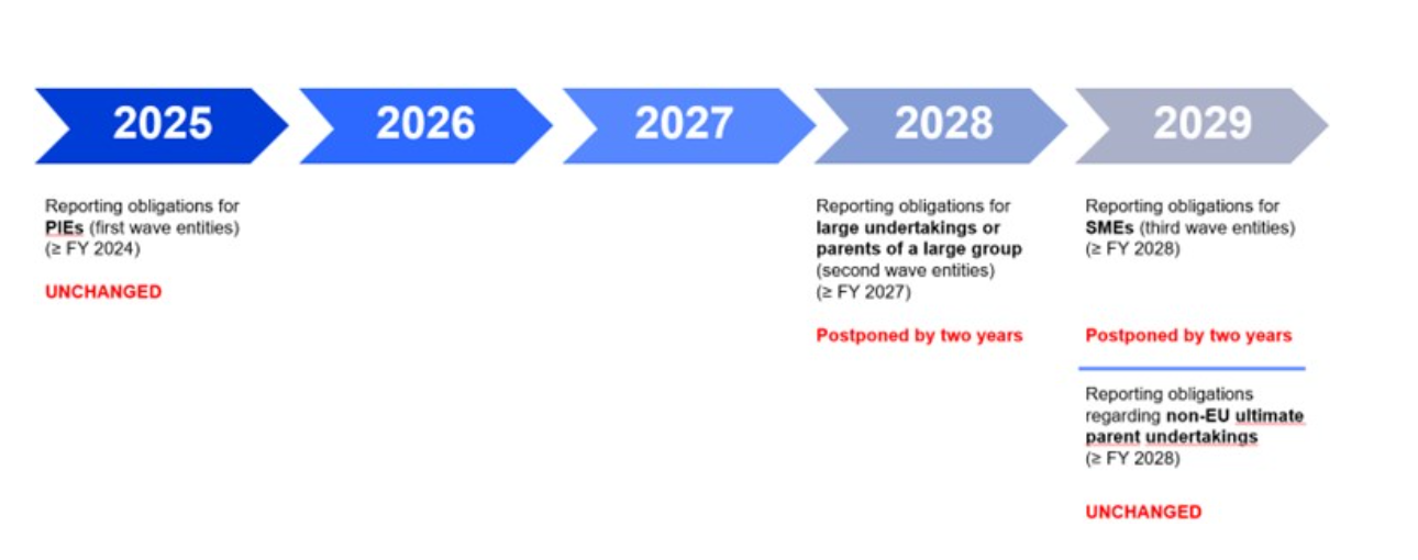 - Kótované MSP: Malé a stredné podniky na regulovanom trhu s povinnosťou vykazovania podľa postupného časového plánu EÚ platí tzv. OMNIBUS: STOP-THE-CLOCK EÚ parlament 03. 04. 2025 oficiálne schválil odloženie povinnosti ESG reportingu o 2 roky s cieľom obmedziť záťaž pre menšie podniky, v ktorom platí dvojročný odklad ESG reportovania pre podniky z druhej a tretej vlny (t.j. firmy, ktoré mali začať reportovať v rokoch 2026 a 2027). Pôvodný termín (za rok 2025) sa pre tieto subjekty posúva na rok 2027 (prvé reporty budú zverejnené v roku 2028).